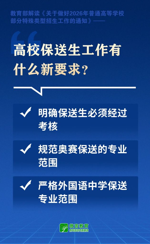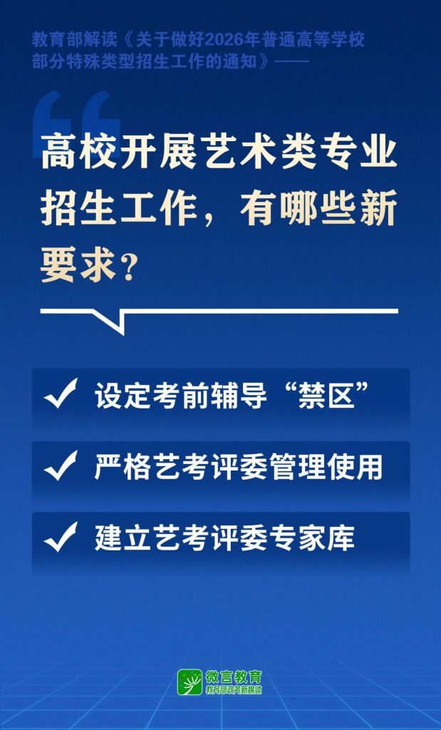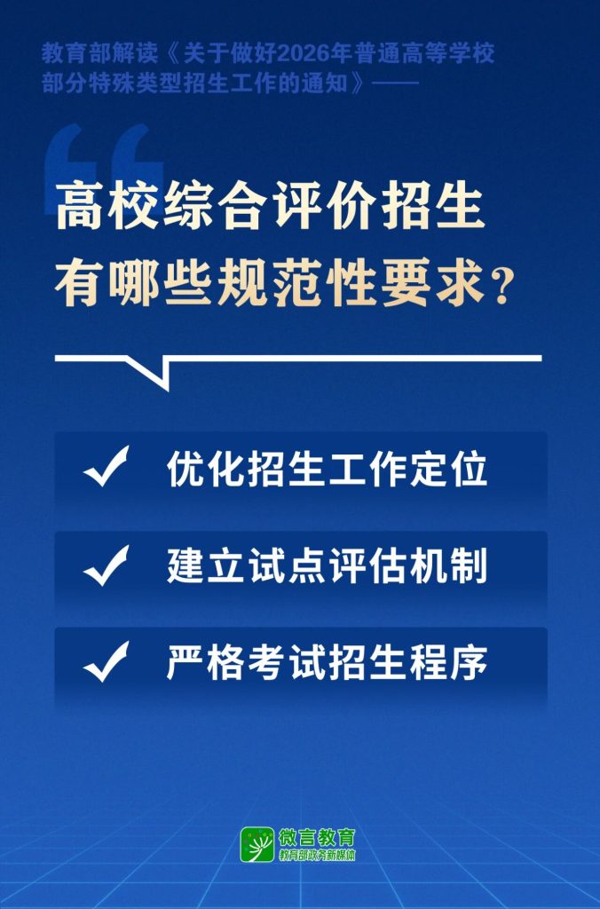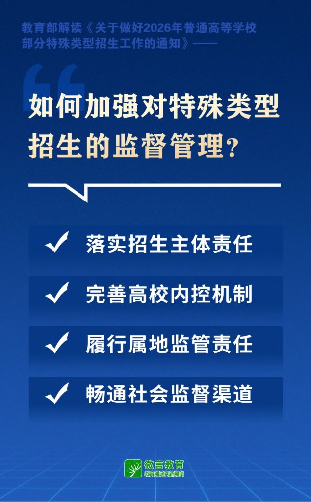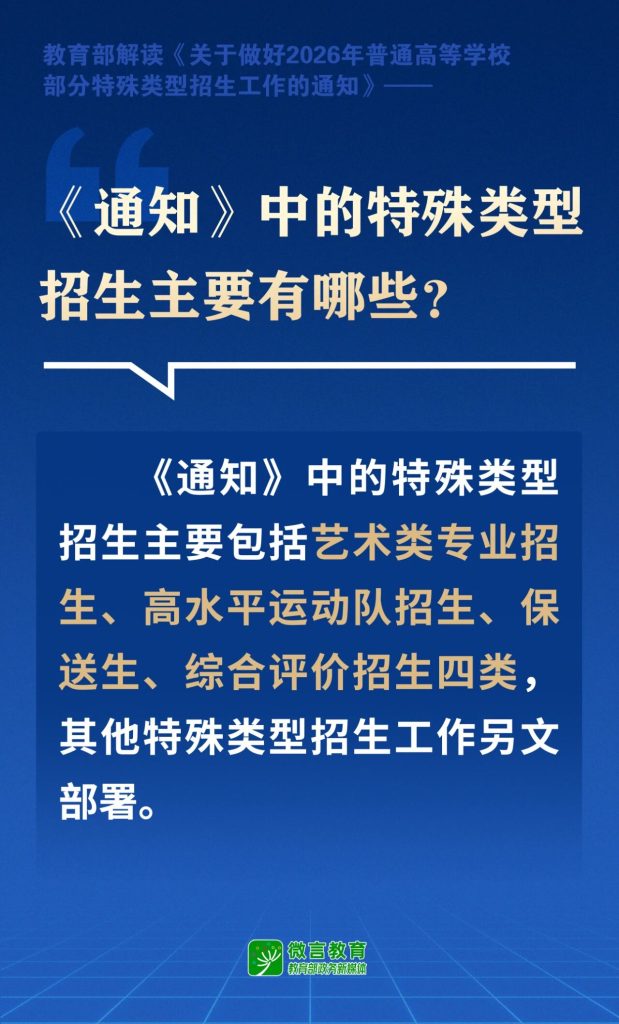日前,教育部印发《关于做好2026年普通高等学校部分特殊类型招生工作的通知》(以下简称《通知》)。特殊类型招生主要有哪些?又有哪些新要求?跟教育小微一起来看——